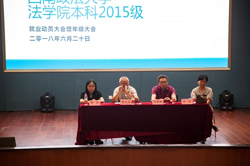 6月20日上午,法学院2015级的同学们在模拟法庭1号厅迎来了本学期就业动员大会暨年级大会的召开,本学院周文茂书记、学工部就业办王朝彬老师以及本年级辅导员刘黔老师、黄丹老师一同出席了本次大会。