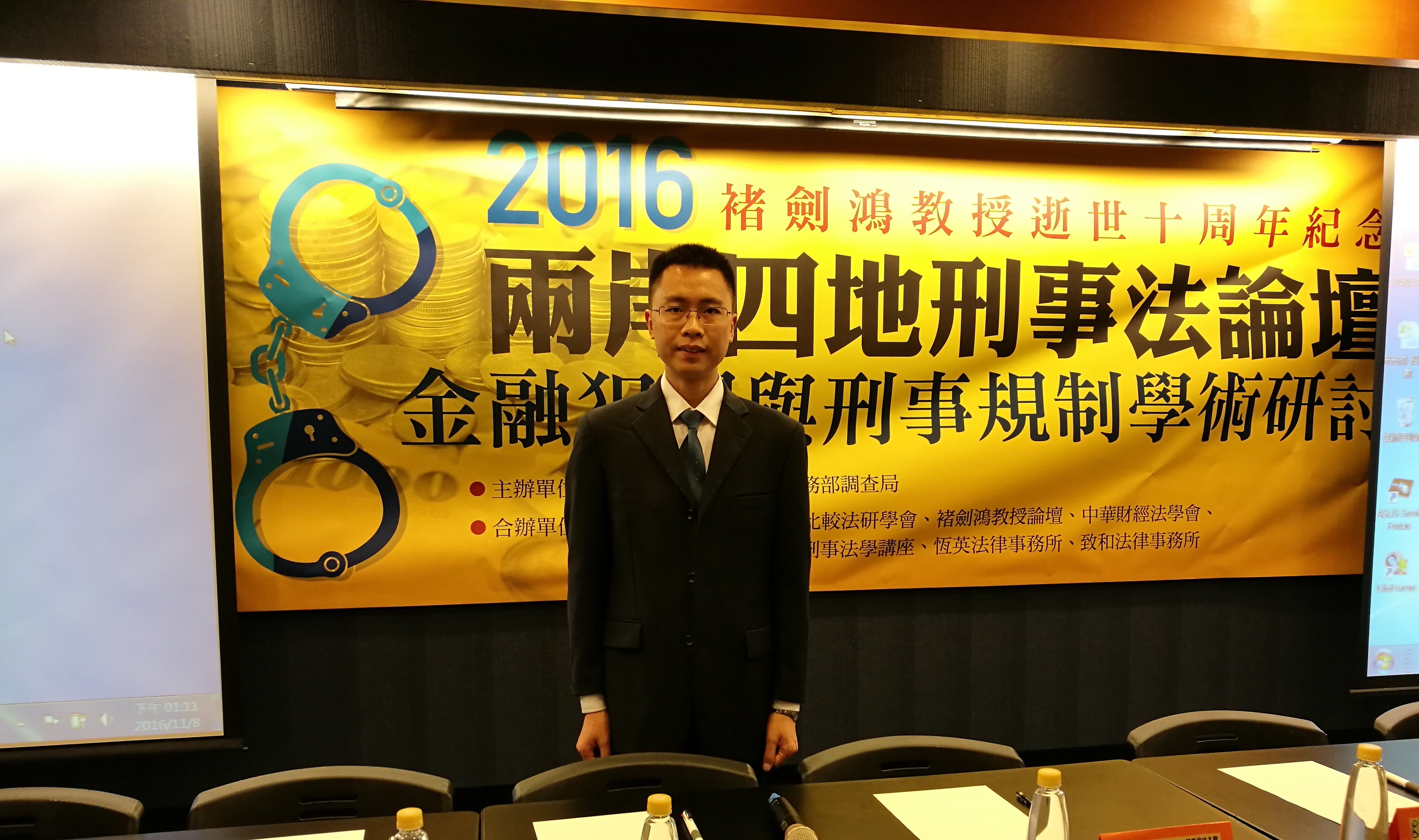 11月6日至10日,2016年两岸四地刑事法论坛“金融犯罪与刑事规制学术研讨会(褚剑鸿教授逝世十周年纪念)”在台湾辅仁大学举行。法学院硕士生导师胡江副教授应邀参加,并在会上作了《大陆地区刑法第196条中“冒用他人信用卡”的教义学阐释》的主题发言。
