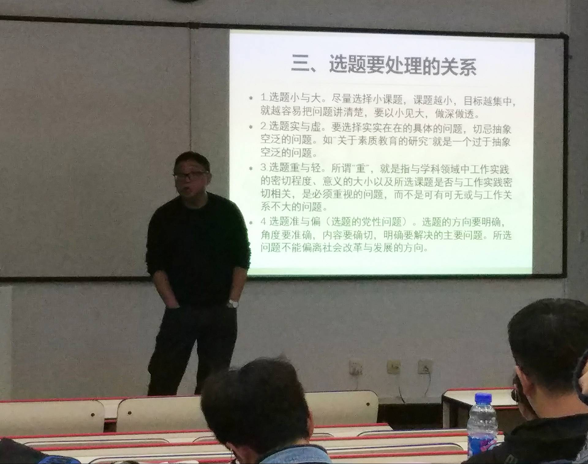 一个创新的项目,其基础便我们的选题。陈老师围绕着选题对同学们做出了多方面的指导。分为以下几个板块:选题的要求与特点、选题的来源和方法、选题要处理的关系、选题的步骤和表达。讲解期间同学们专注认真,并不实有同学就不太清楚的问题向老师提问。