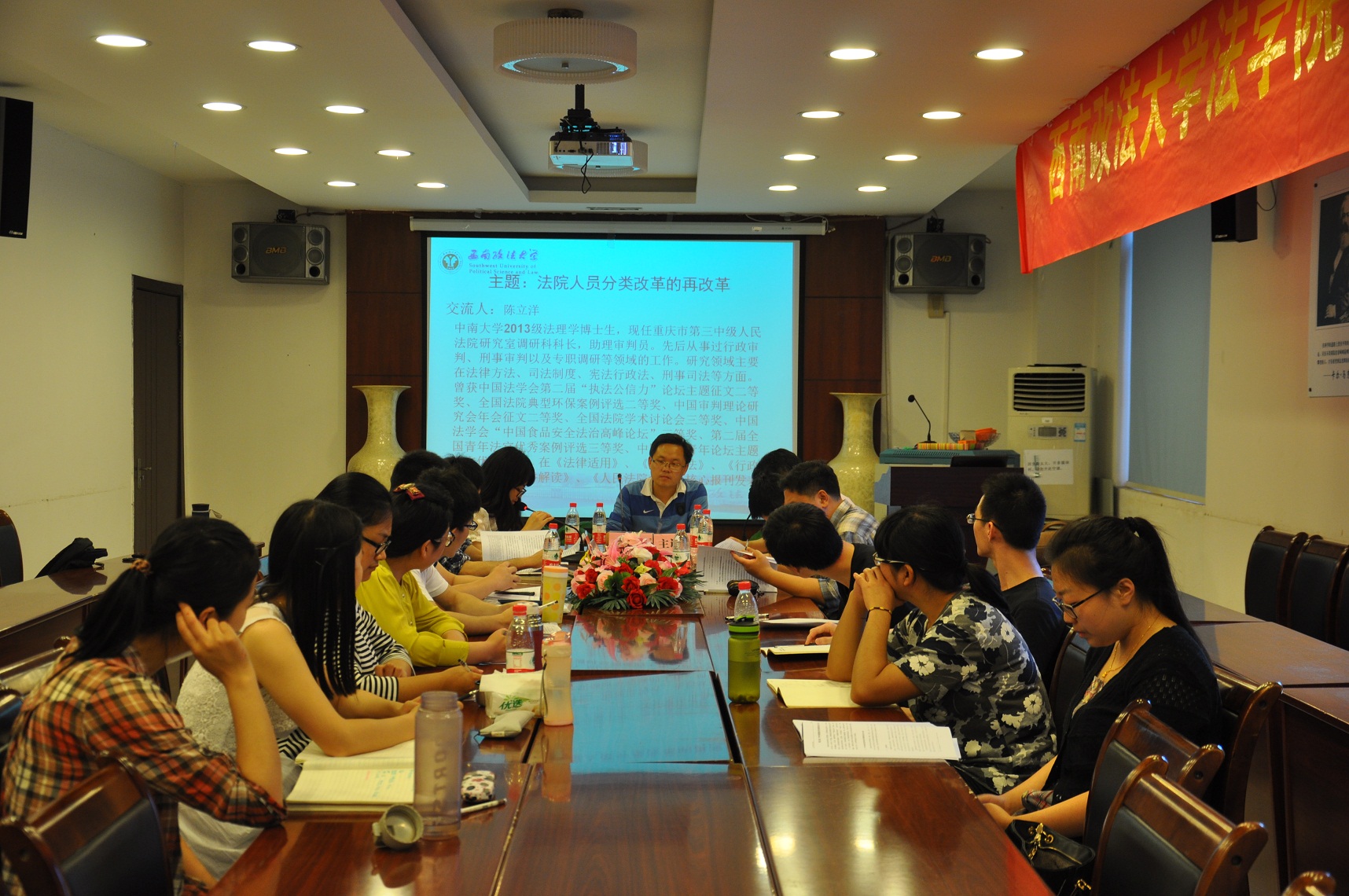 5月29日晚7点,法学院首届博硕论坛(第八讲)在敬业楼3031会议室拉开帷幕,本讲论坛的主题为“法院人员分类改革的再改革”。论坛由院研会副主席、2013级民事诉讼法学硕士生高斯亮担任主持,主讲嘉宾是法学院2013级民事诉讼法学博士生娄必县,参与论坛交流的嘉宾有龚海南(我校2014级民商法博士生)、陈立洋(中南大学2013级法理学博士生)、江河(我校2012级民商法博士生)三位。出席论坛的还有本讲点评嘉宾肖晖副教授,以及法学院部分博士生、硕士生。