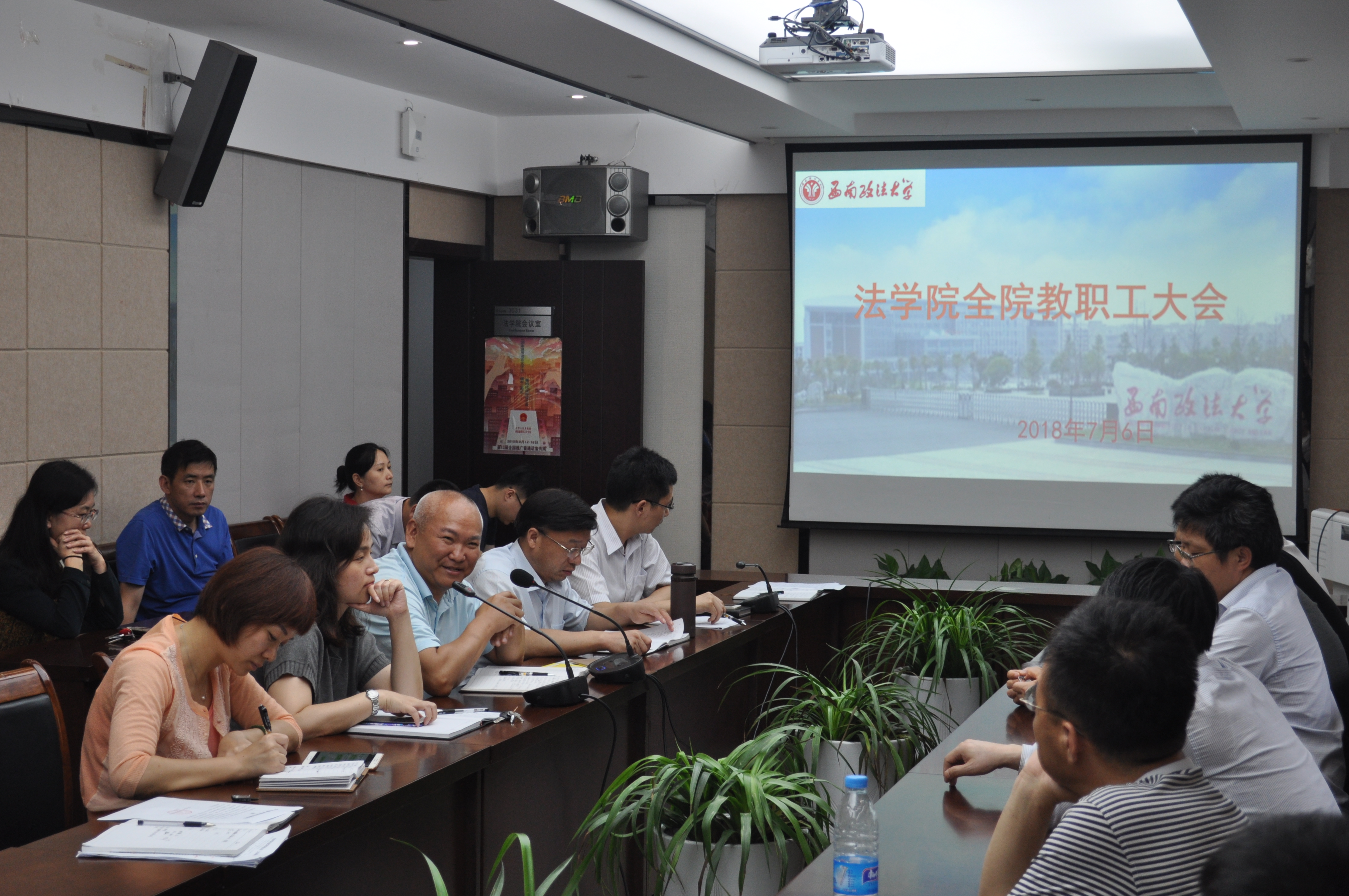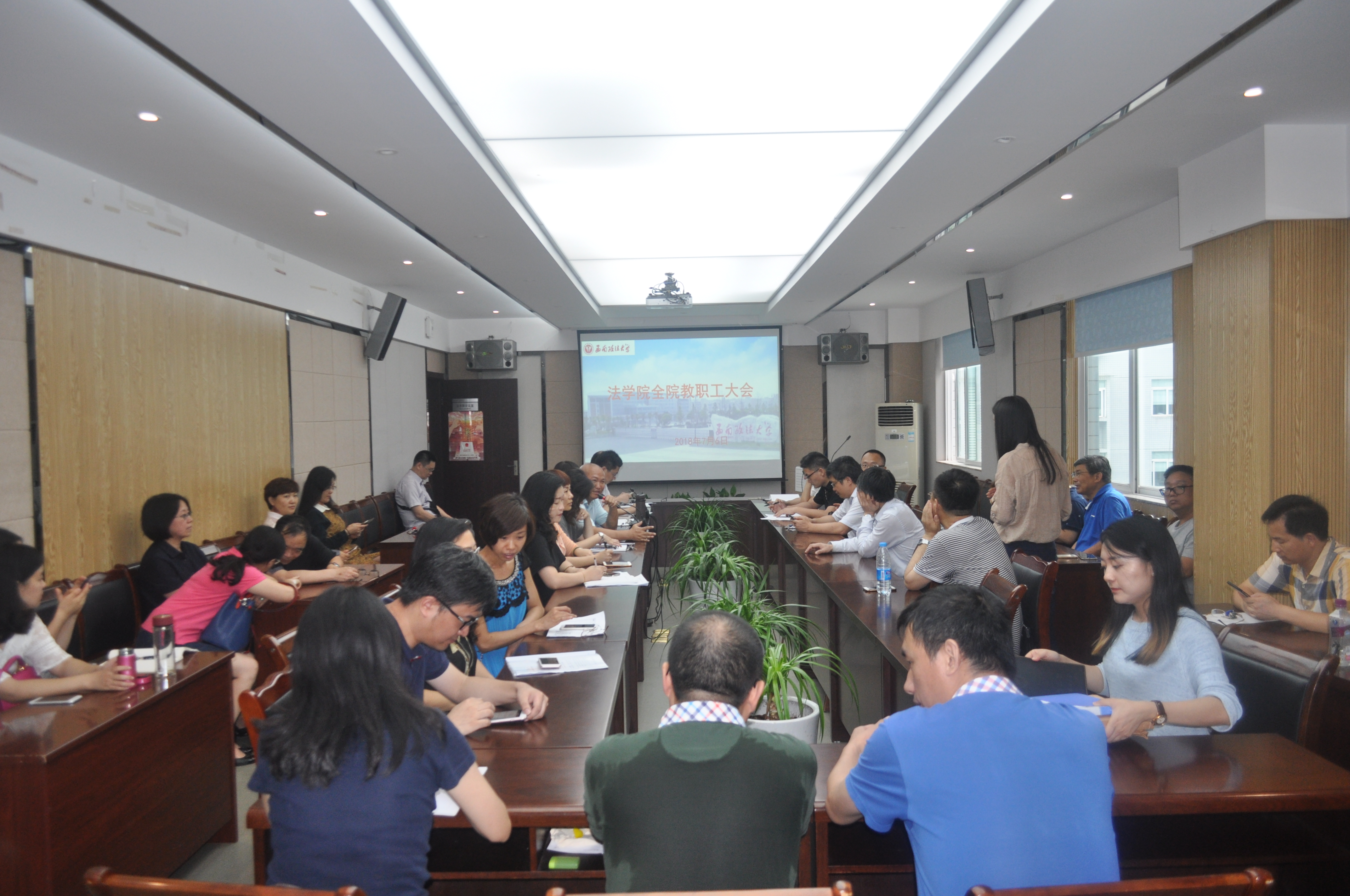 7月6日下午,法学院在敬业楼3031会议室召开2018年第一学期期末全院教职工大会,学院全体教职工参加本了次会议,会议由周文茂书记主持。