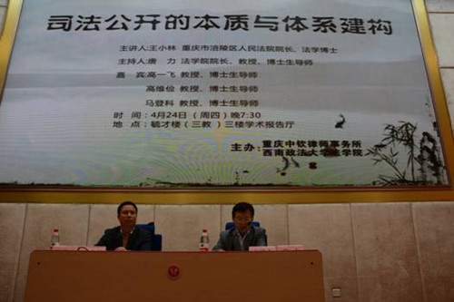 4 月24日 晚7:30,重庆市涪陵区人民法院王小林院长作客我校“中钦法律实务大讲堂”,在毓才楼三楼学术报告厅举办了一场题为《司法公开的本质与体系构建》的学术讲座。本次讲座由我校法学院院长、教授、博士生导师唐力教授主持。高维俭教授、高一飞教授、马登科教授以及重庆中钦律师事务所30余名律师作为嘉宾出席了本次讲座。