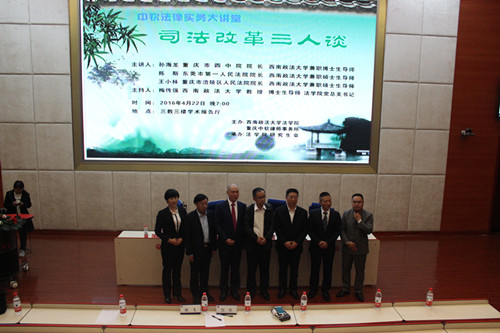 2016年4月22日晚上,“中钦法律实务大讲堂——司法改革三人谈”在毓才楼三楼学术报告厅举办,重庆市四中院院长、党总支书记、西南政法大学兼职博士生导师孙海龙,东莞市第一人民法院院长、党总支书记、西南政法大学兼职硕士生导师陈斯,重庆市涪陵区人民法院院长、西南政法大学兼职硕士生导师王小林受邀参加讲座。本次讲座主持人由法学院党总支书记、博士生导师梅传强教授担任。